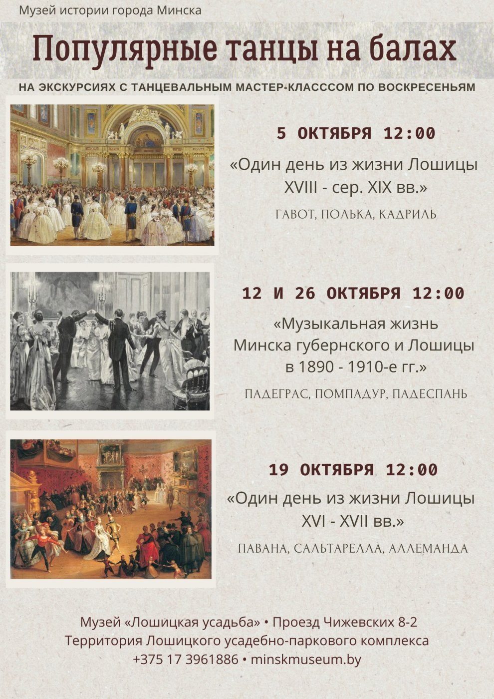 Музей "Лошицкая усадьба" приглашает желающих присоединиться к экскурсиям с танцевальным мастер-классом, которые будут проходить каждое воскресенье октября. В ноябре гости экскурсий примут участие в Танцевальном квизе!